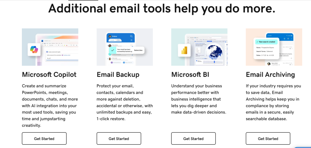 A domain-based email builds credibility, reinforces your brand with every communication, and is secured by proactive protection via Microsoft 365’s Advanced Email Security. Additionally, GoDaddy provides email backup, archiving, and seamless email migration. Professional Email comes with a 30-day free trial when you choose GoDaddy Airo™.