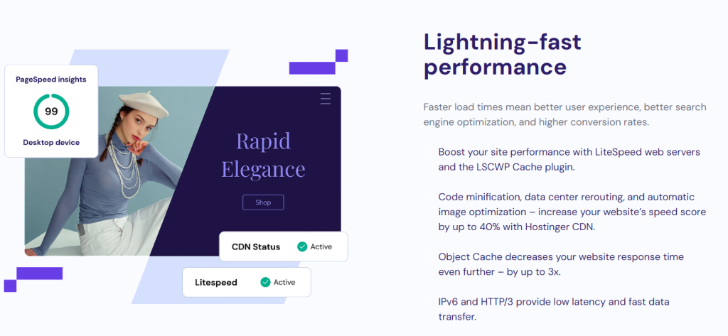 Hostinger promotes its “Cloud VPS” as delivering exceptional speed and a zero-downtime guarantee, ensuring your website remains fast and accessible at all times. The VPS system features a dedicated control panel and offers high levels of customization for user convenience.